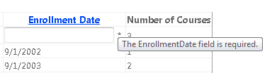 EnrollmentDatewill display as a date (without a time).- Both name fields must be 25 characters or less in length, and a custom error message is provided.