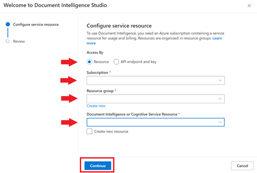 Go to Document Intelligence Studio. If it's your first time signing in, you're prompted to configure your service resource. In accordance with your organization's policy, you have the following options: