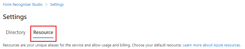 To view resource details such as name and pricing tier, select the Settings icon in the upper-right corner of the Document Intelligence Studio home page, and then select the Resource tab. If you have access to other resources, you can also switch resources.