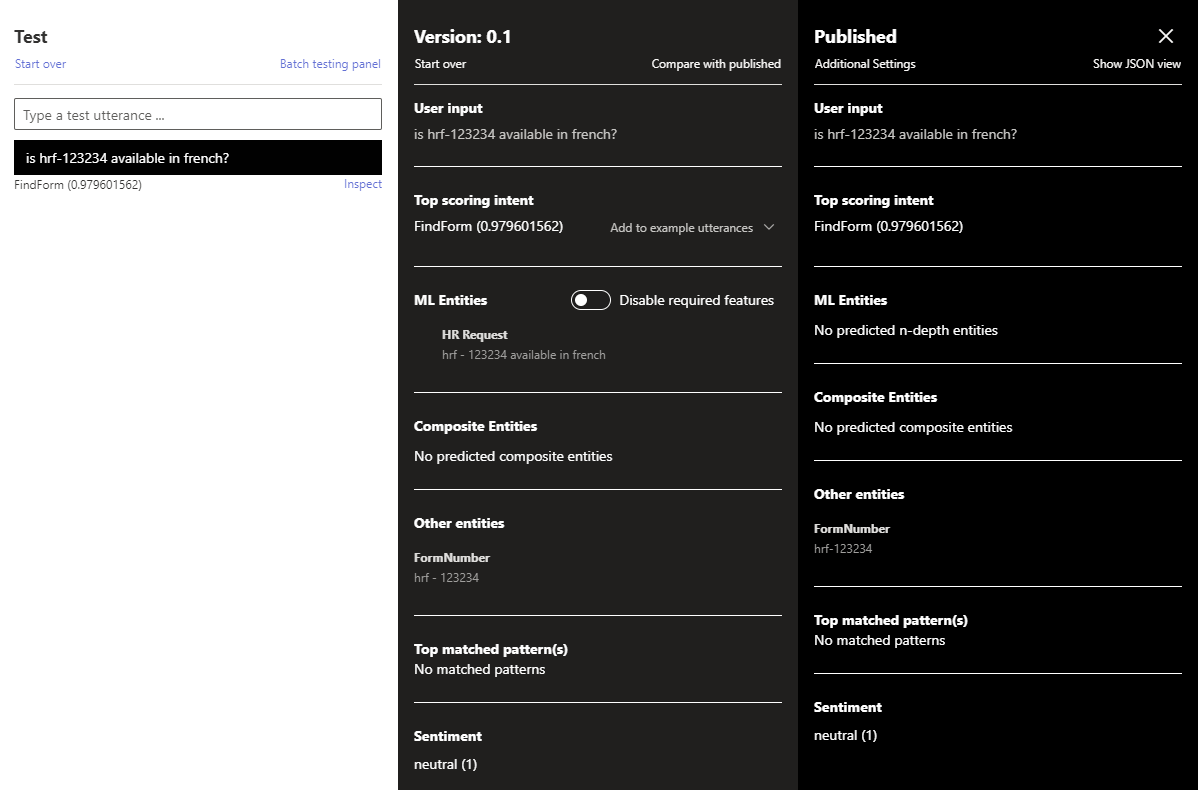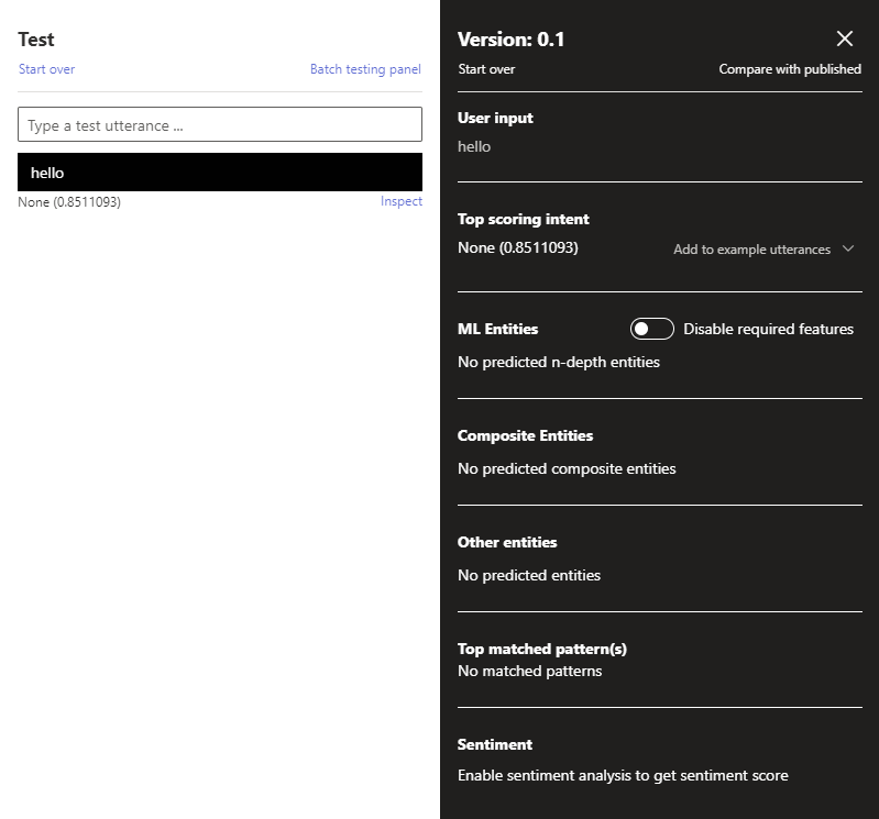 If sentiment analysis is configured on the Publish page, the test results will include the sentiment found in the utterance.