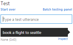 1. Enter an utterance in the text box and press the enter button on the keyboard. You can test a single utterance in the Test box, or multiple utterances as a batch in the Batch testing panel.