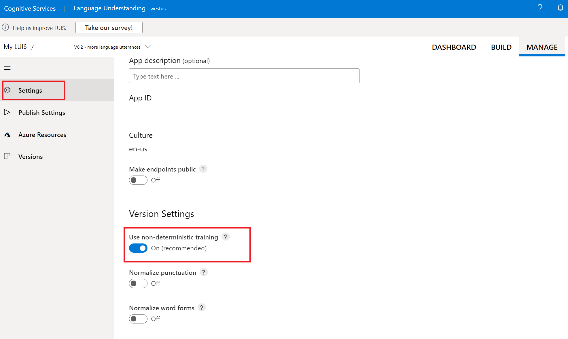 Log into the LUIS portal and select your app. Select Manage at the top of the screen, then select Settings. Enable or disable the use non-deterministic training option. When disabled, training will use all available data. Training will only use a random sample of data from other intents as negative data when training each intent