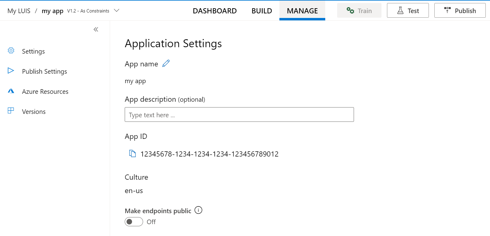This ID is used to select the app. You can find the app ID in the LUIS portal by clicking Manage at the top of the screen for your app, and then Settings.