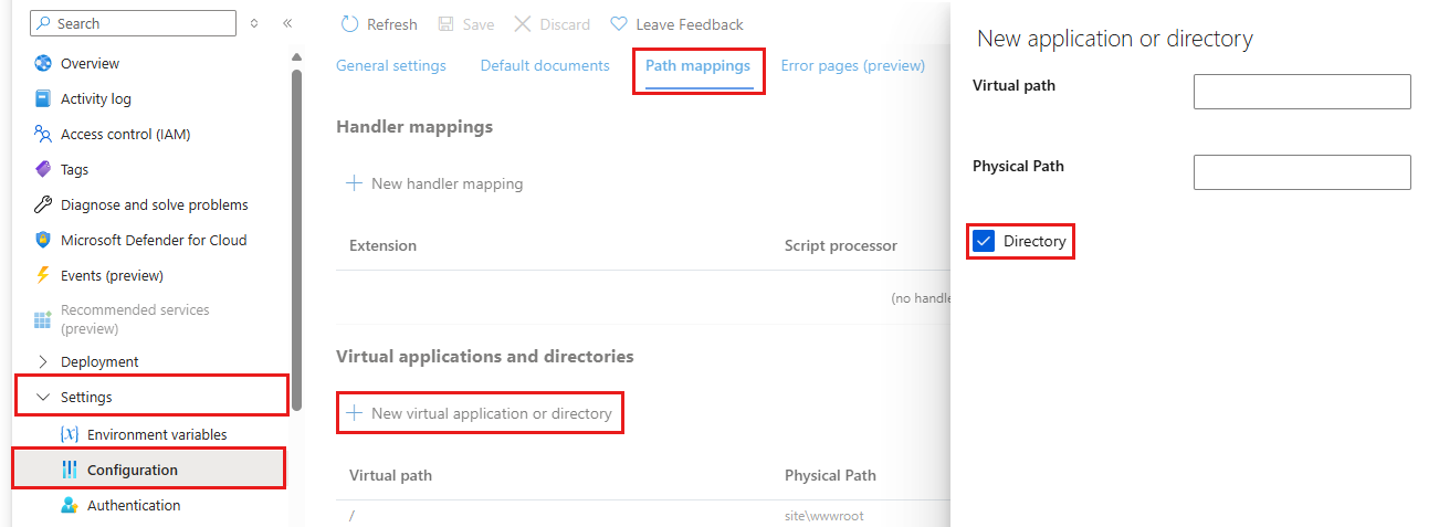 On the app's left menu, select Settings > Configuration. Then select Path mappings.