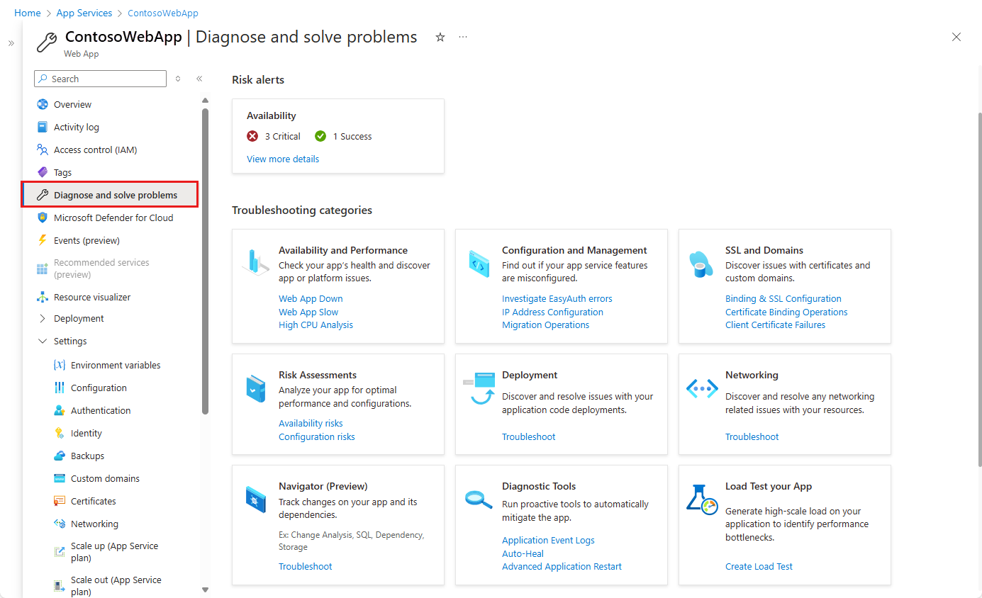 The App Service diagnostics page provides many tools to diagnose app problems. For more information, see Diagnostic tools later in this article.