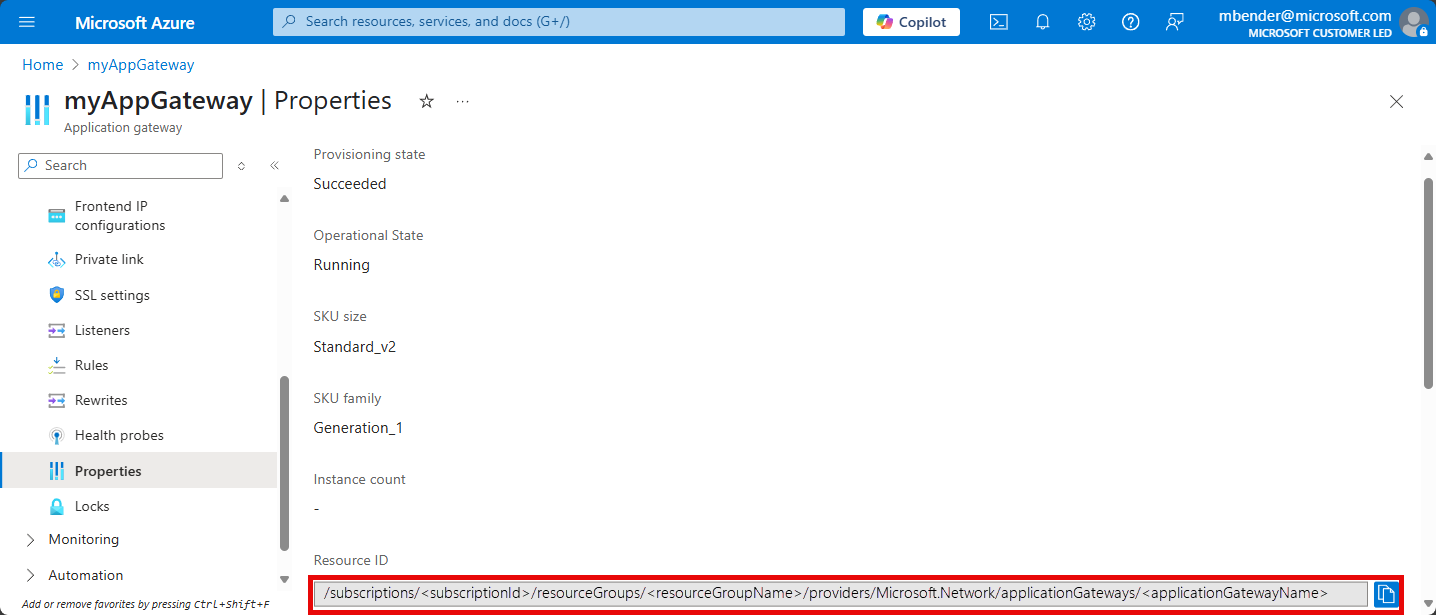 Note your application gateway's resource ID for which logging is enabled. This value is of the form: /subscriptions/<subscriptionId>/resourceGroups/<resourceGroupName>/providers/Microsoft.Network/applicationGateways/<applicationGatewayName>. You can use the portal to find this information.