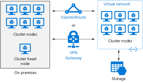In this scenario, you run HPC Pack on-premises and use Azure VMs for burst capacity. The cluster head node is on-premises. Azure ExpressRoute or Azure VPN Gateway connects the on-premises network to the Azure virtual network.