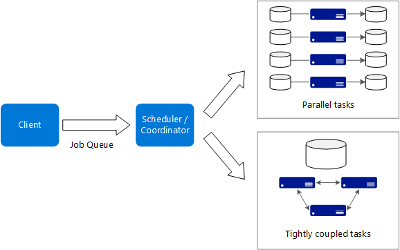 Each task is finite. It takes input, processes that input, and produces an output. The entire application can run for a few minutes to several days, but it runs for a finite amount of time. A common pattern is to provision a large number of cores in a burst and then reduce the number of cores to zero when the application completes.