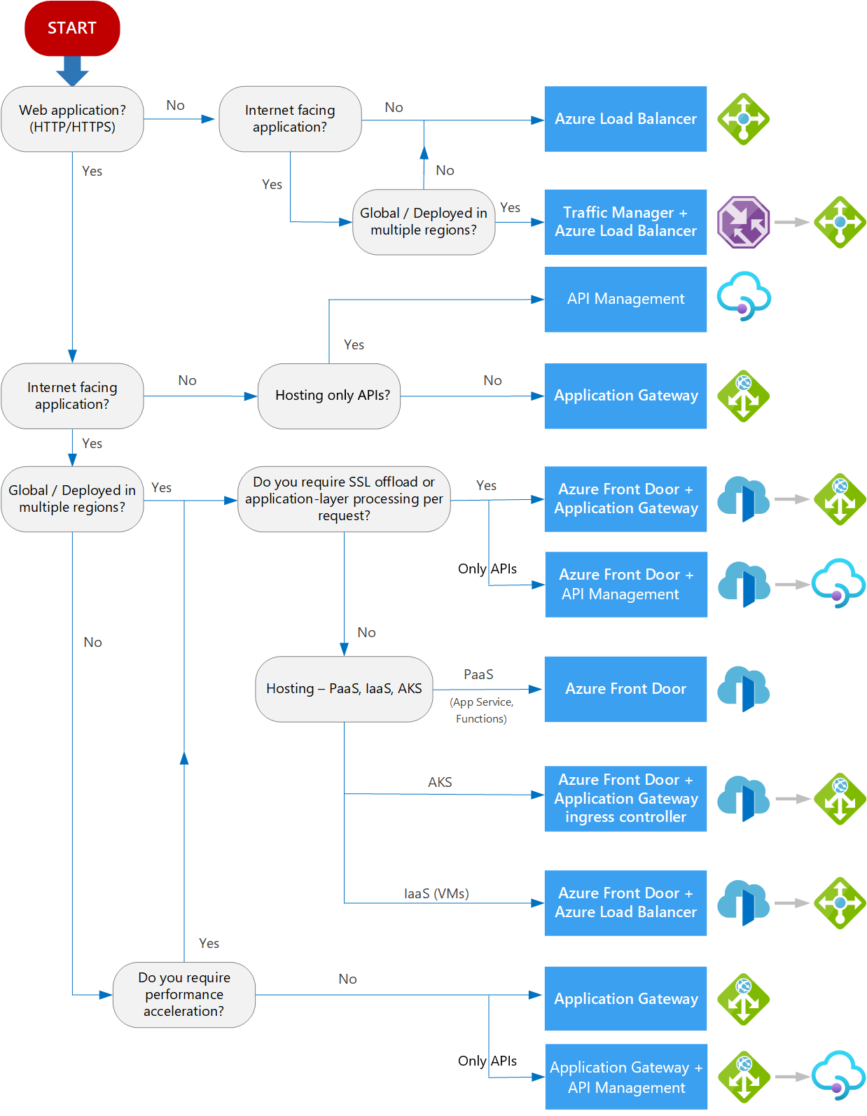 The following flow chart helps you choose a load balancing solution for your application. The flow chart guides you through a set of key decision criteria to reach a recommendation.