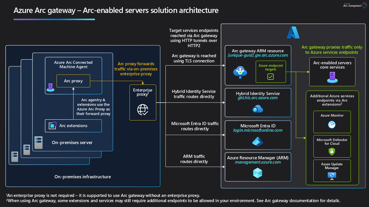 When the gateway is in place, traffic flows via Azure Arc agents > Azure Arc proxy > Enterprise proxy > Azure Arc gateway > Target service. For more information, see Azure Arc gateway forwarding protocol.