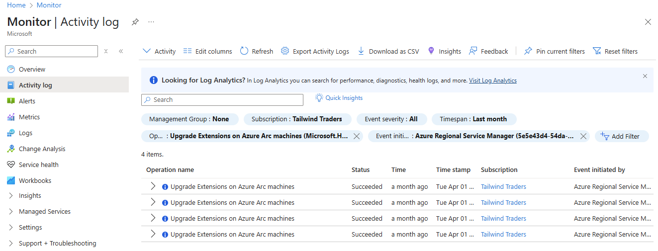 To view automatic extension upgrade history, search for the Activity Log in the Azure portal. Select Add filter and choose the Operation filter. For the filter criteria, search for "Upgrade Extensions on Azure Arc machines" and select that option. To only see automatic upgrade attempts and exclude upgrades manually initiated by users, add a second filter for Event initiated by and set "Azure Regional Service Manager" as the filter criteria.
