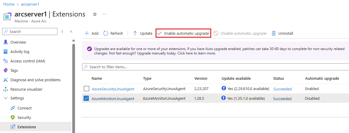Automatic extension upgrade is enabled by default when you install extensions on Azure Arc-enabled servers. You can enable or disable automatic upgrades for an existing extension on an Arc-enabled server at any time by using the Azure portal, Azure CLI (available for Linux and Windows), or Azure PowerShell.