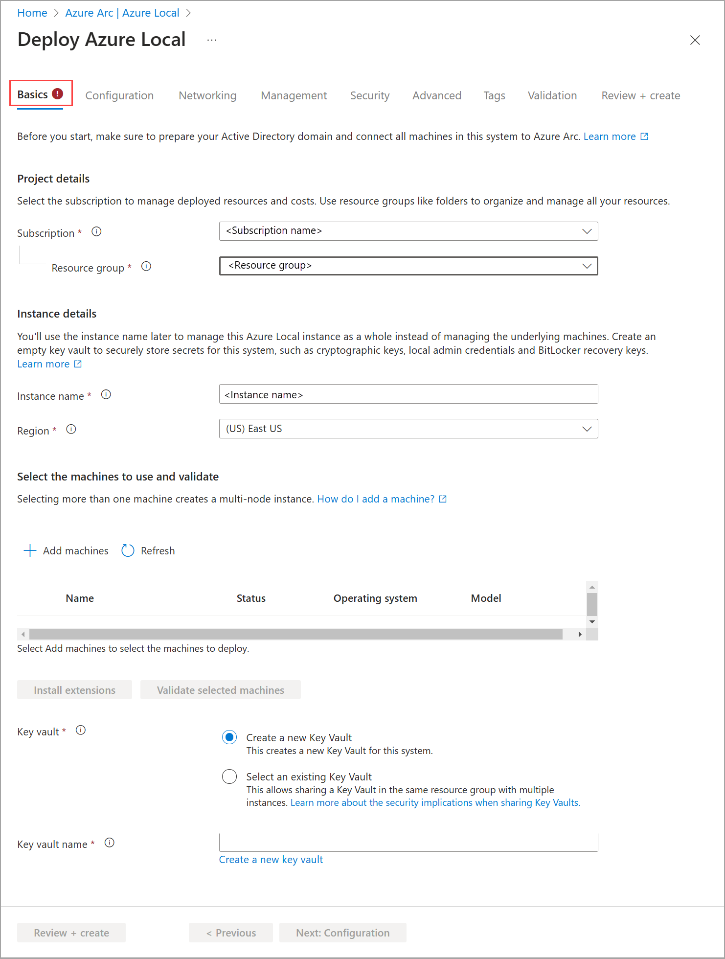 Select an existing Key Vault or select Create a new Key Vault. Create an empty key vault to securely store secrets for this system, such as cryptographic keys, local admin credentials, and BitLocker recovery keys.