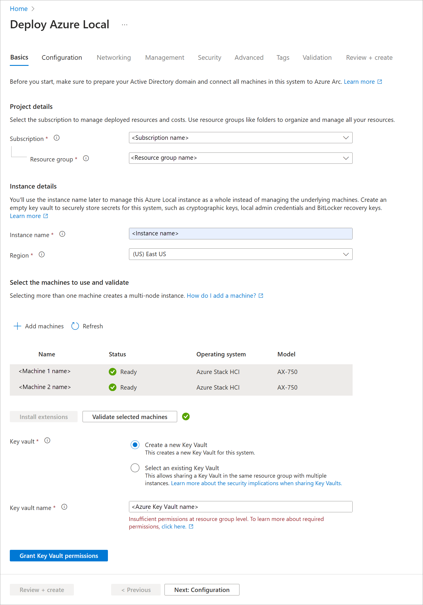 - If you don’t have permissions to the resource group, you see a message that you have insufficient permissions for the key vault. Select Grant key vault permissions.