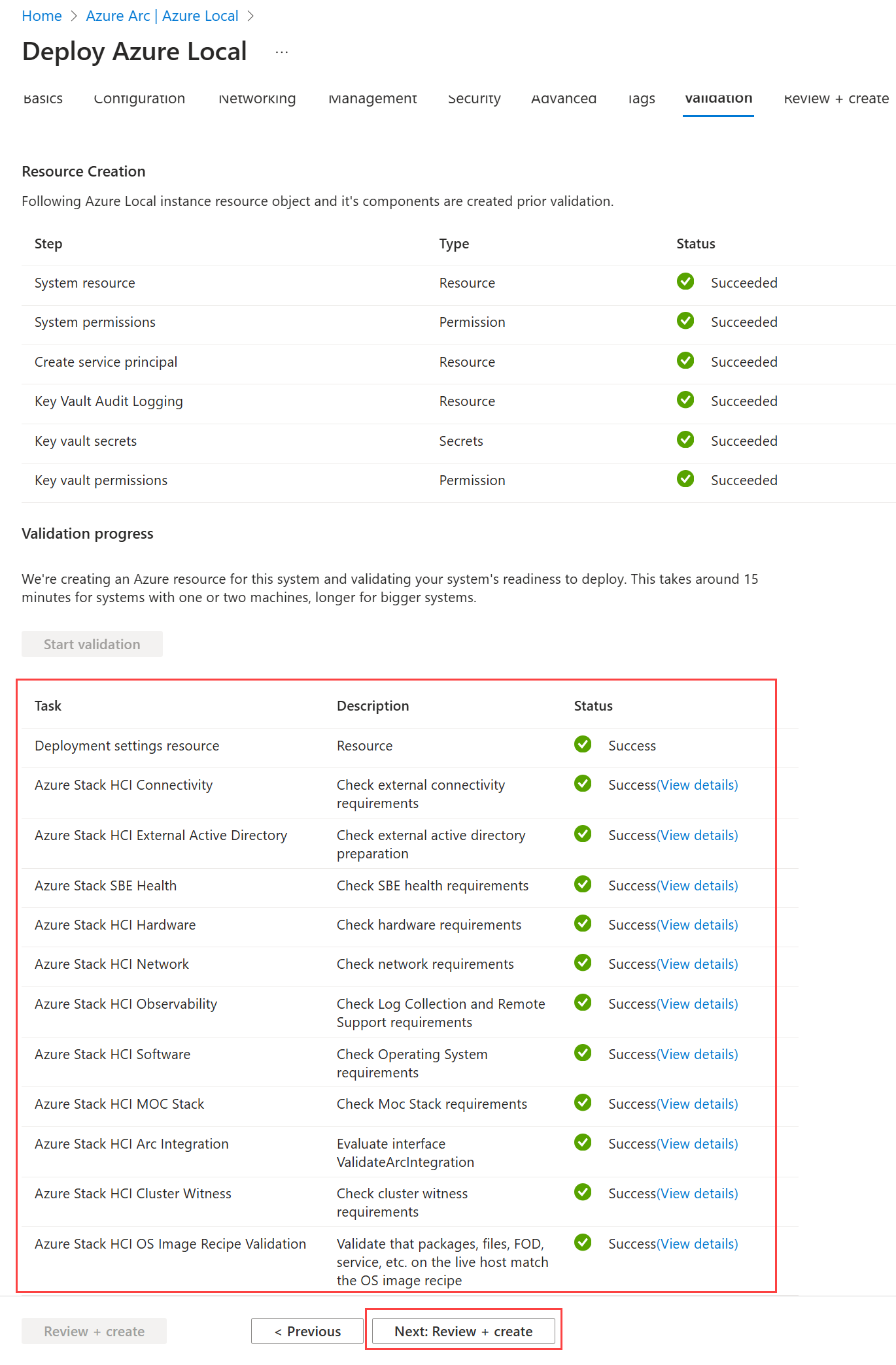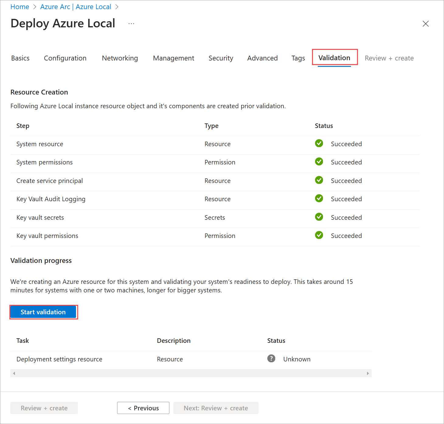 The validation takes about 15 minutes to deploy one to two machines and longer for bigger deployments. Monitor the validation progress.