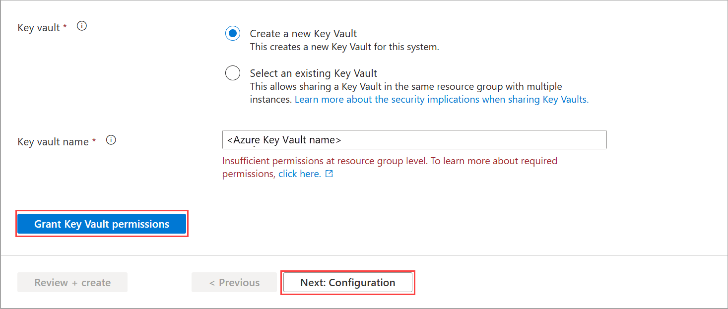 - If you don’t have permissions to the resource group, you see a message that you have insufficient permissions for the key vault. Select Grant key vault permissions.