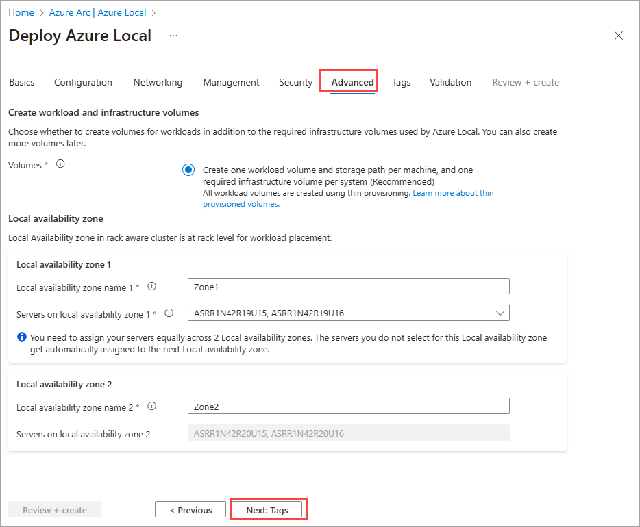 # machines Volume resiliency # Infrastructure volumes # Workload volumes Single machine Two-way mirror 1 1 Two machines Two-way mirror 1 2 Three machines + Three-way mirror 1 1 per machine Specify the Local availability zone settings. Ensure servers in the same zone are physically in the same rack. This check isn't validated during the deployment process in this release so the correct configuration is critical. If misconfigured, a single rack failure could take down the entire cluster.