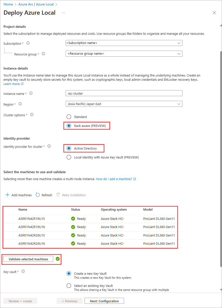 In this step, select Rack aware cluster for the Cluster options. If you select this option, you can only deploy with Active Directory. Local identity with key vault is not supported for rack aware clusters in this release.