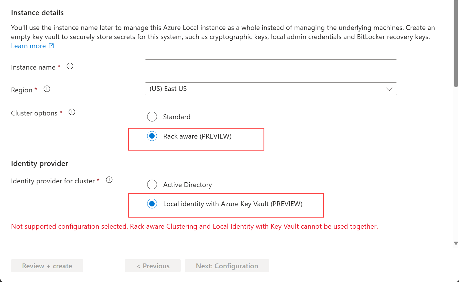 If you select Rack aware cluster and Local identity with Azure Key Vault together, you see an error to the effect that the combination is not supported.