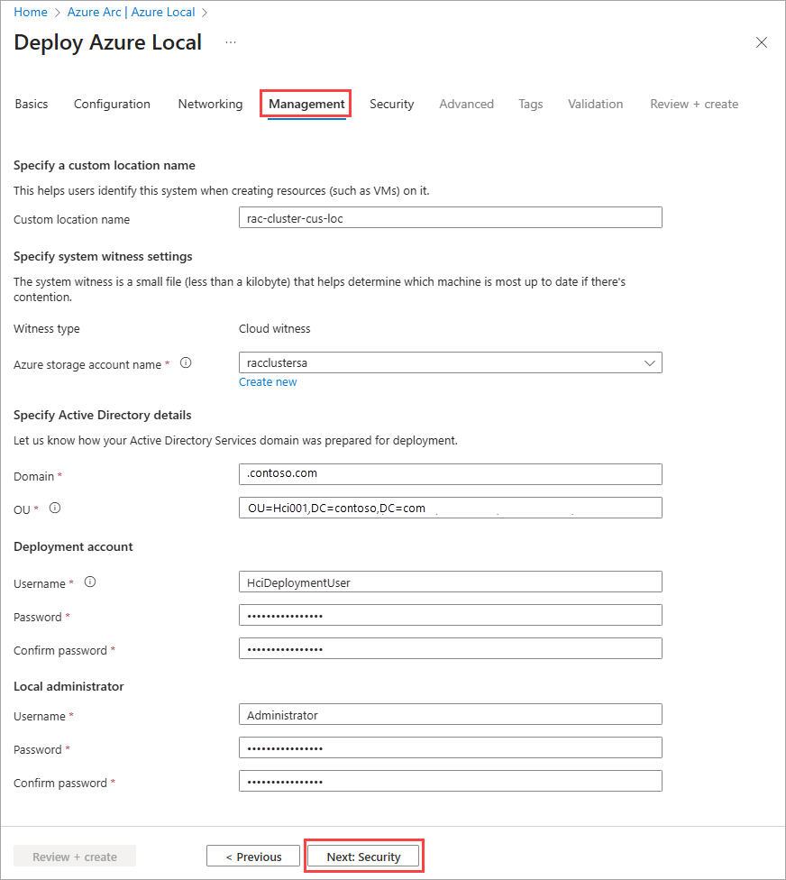 OU=Local001,DC=contoso,DC=com.Enter the Deployment account credentials. This domain user account was created when the domain was prepared for deployment.