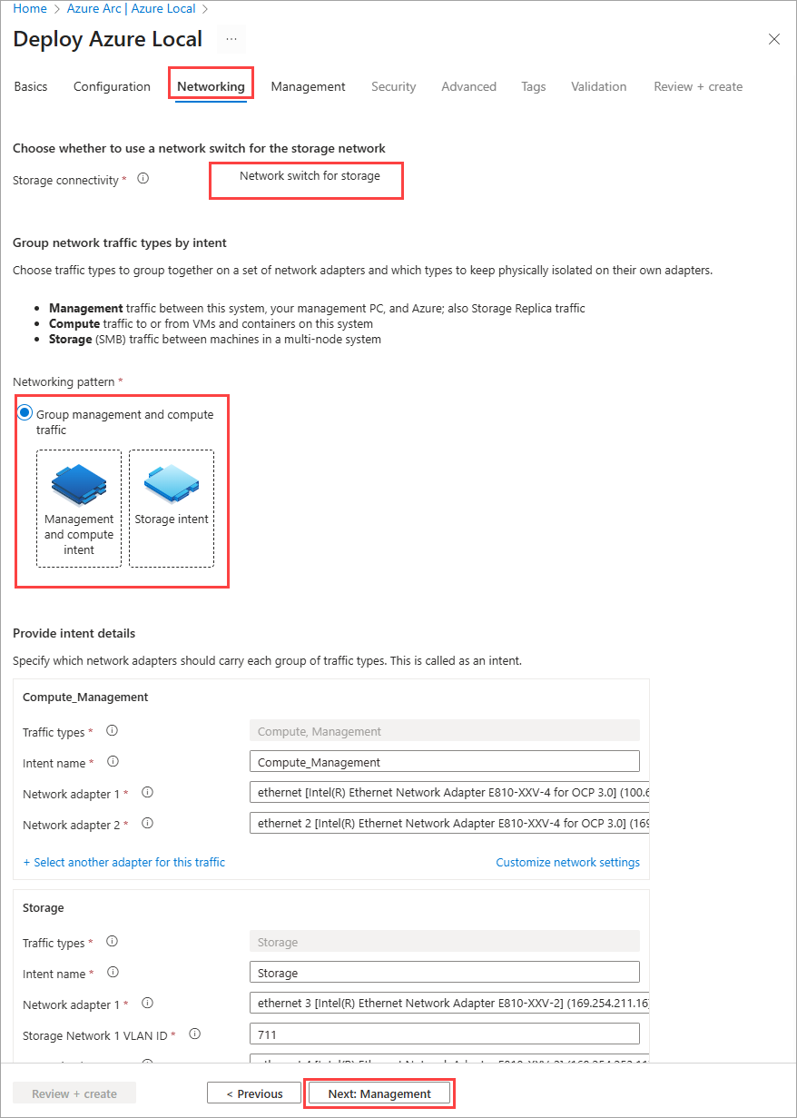 Choose the only networking pattern available for a rack aware cluster as Group management and compute traffic. This groups management and compute traffic together on one set of adapters while keeping storage traffic isolated on dedicated high-speed adapters. You create two network intents: