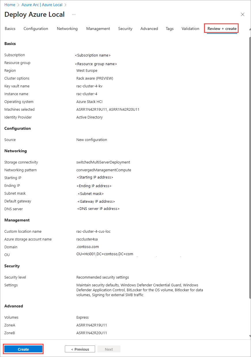 To deploy a rack aware cluster, follow the steps to Deploy an Azure Local instance via the Azure portal. In general, the steps are similar to deploying a standard single cluster. The differences are highlighted in the next sections.