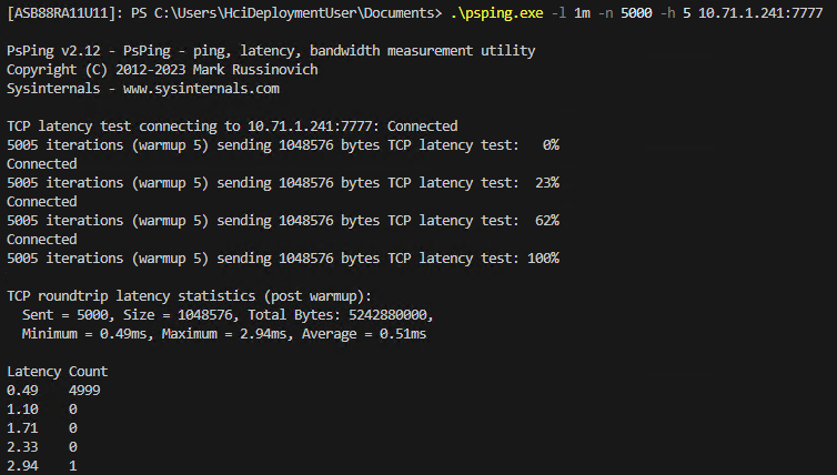 pspingclient on another host. Run this command:.\psping.exe -l 1m -n 5000 -h 5 \<SERVER_IP\>:\<PORT\>Review output analysis: After the test is complete,