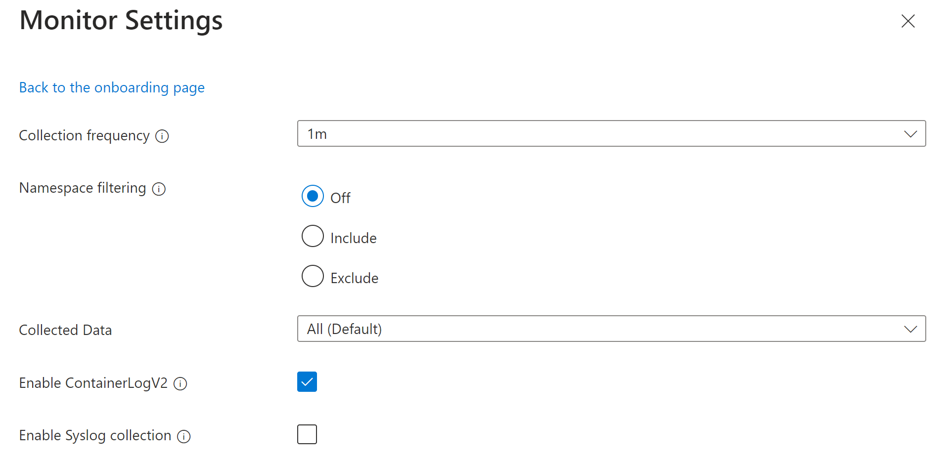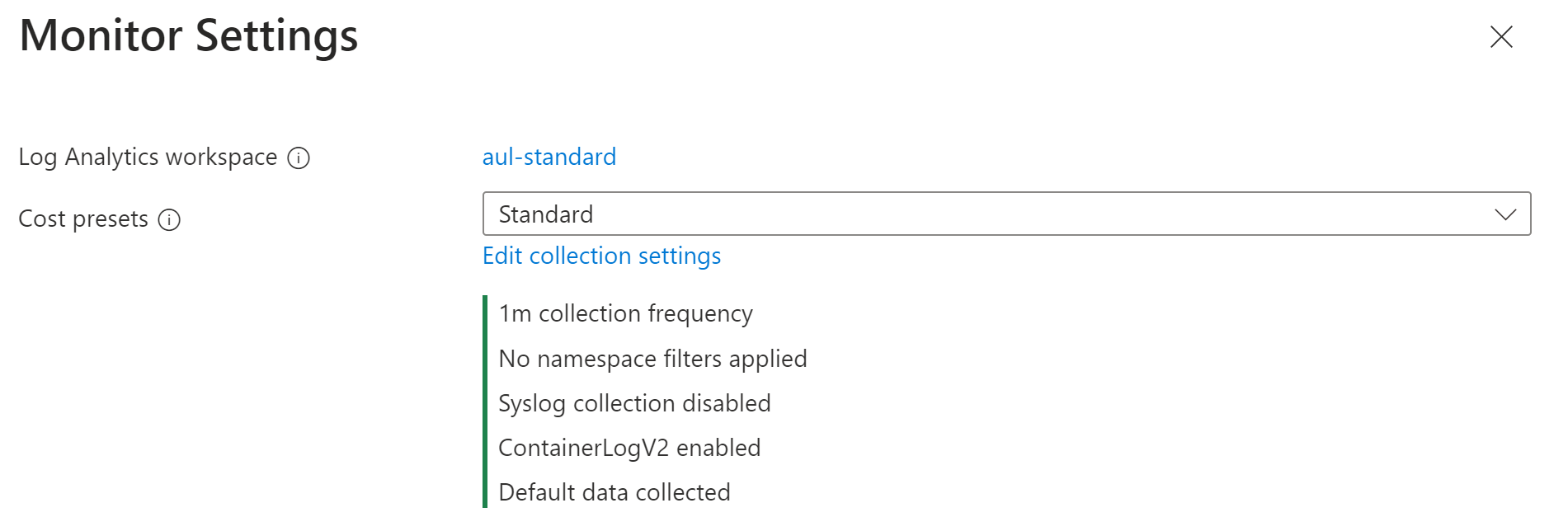 az aks enable-addons --addon monitoring --name <cluster-name> --resource-group <cluster-resource-group-name> --workspace-resource-id <workspace-resource-id> --data-collection-settings dataCollectionSettings.json