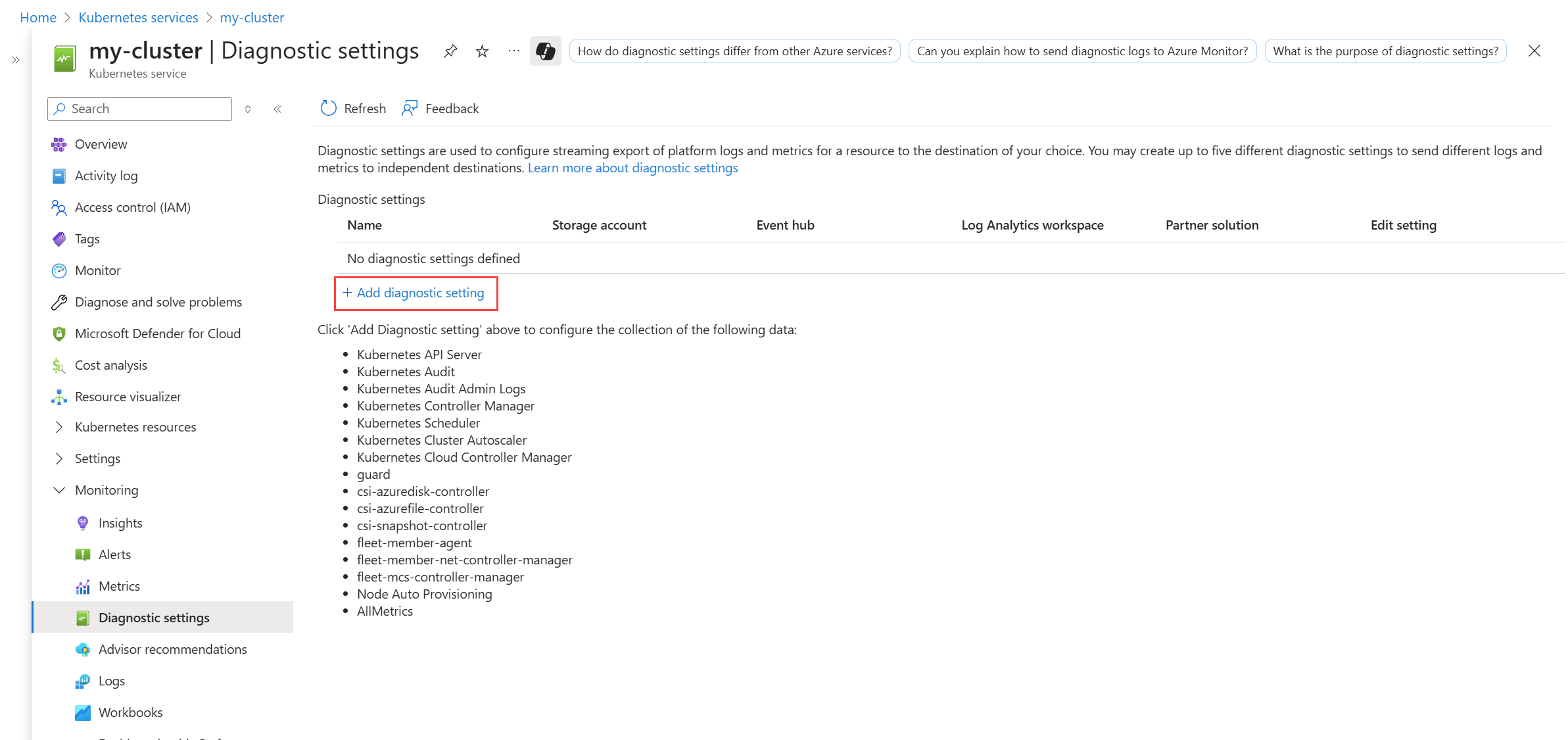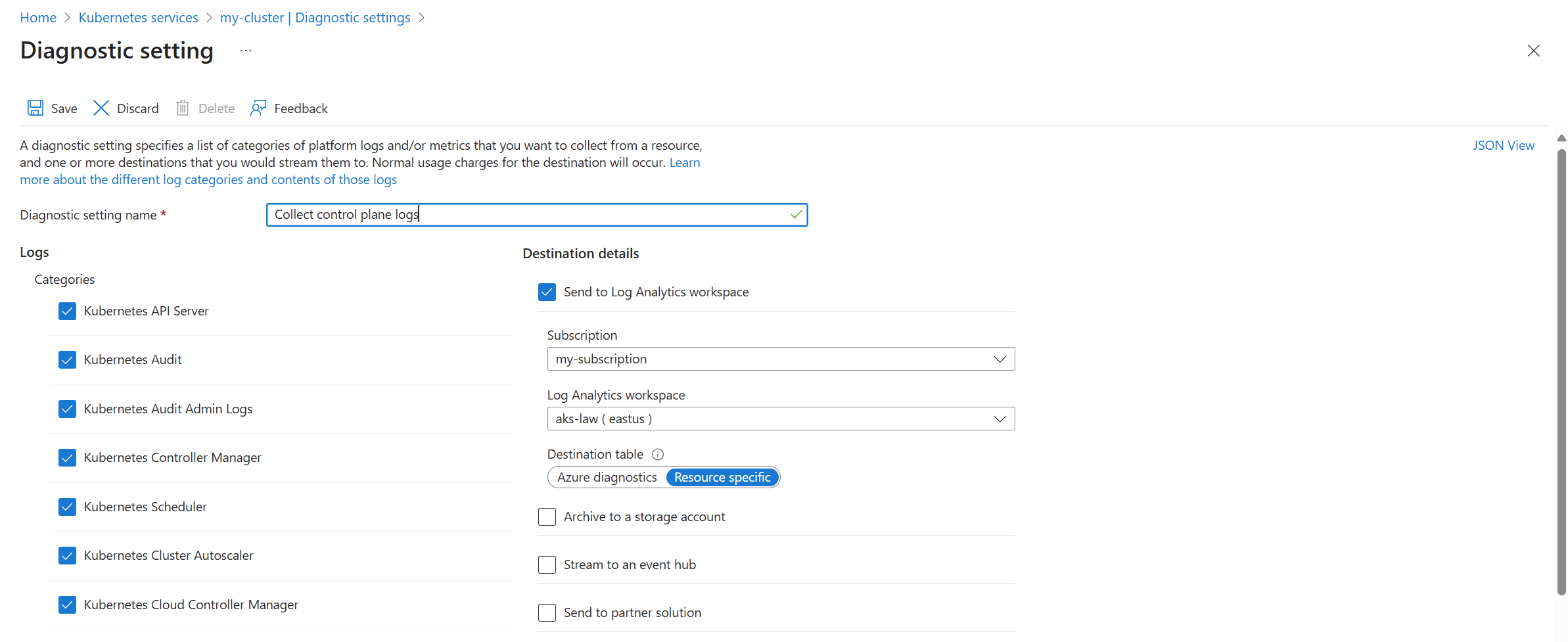 Control plane logs are implemented as resource logs in Azure Monitor. To collect these logs, create a diagnostic setting for the cluster. Send them to the same Log Analytics workspace as your container logs.