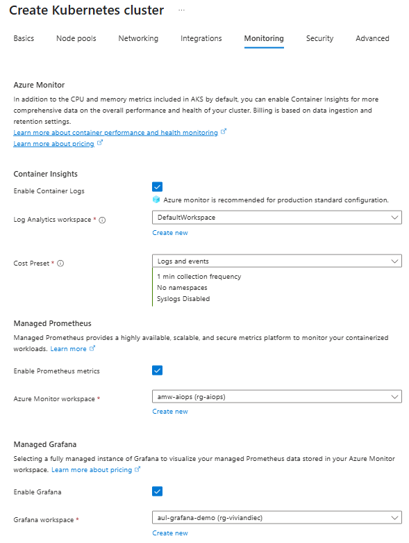 | Managed Grafana | Azure Managed Grafana workspace | Link your Grafana workspace to your Azure Monitor workspace to make the Prometheus metrics collected from your cluster available to Grafana dashboards. |