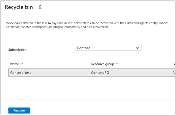 If you aren't sure if a deleted workspace is in a soft-delete state and can be recovered, in the Azure portal, select Open recycle bin on the Log Analytics workspaces page to see a list of soft-deleted workspaces per subscription. Permanently deleted workspaces aren't included in the list.