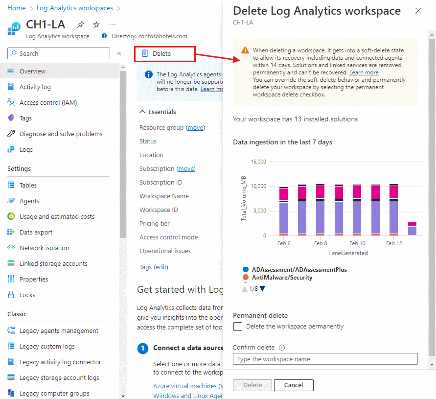 Be careful when you delete a workspace because there might be important data and configuration that might negatively affect your service operation. Review what agents, solutions, and other Azure services store their data in Log Analytics, such as: