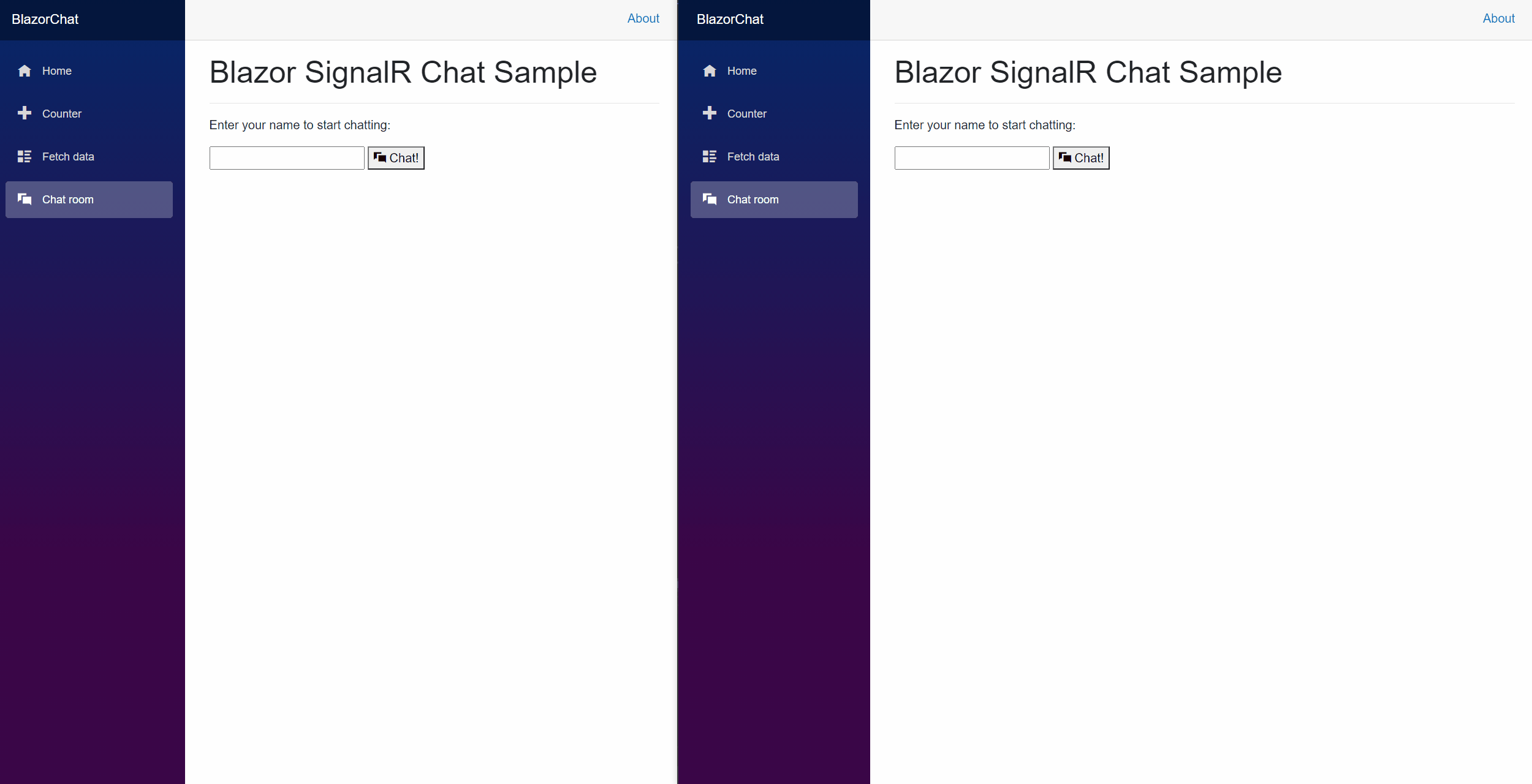 NavMenu.razorcomponent to insert a newNavLinkcomponent to link to the chat room underNavMenuCssClass.<li class="nav-item px-3"> <NavLink class="nav-link" href="chatroom"> <span class="oi oi-chat" aria-hidden="true"></span> Chat room </NavLink> </li>Add a few CSS classes to the