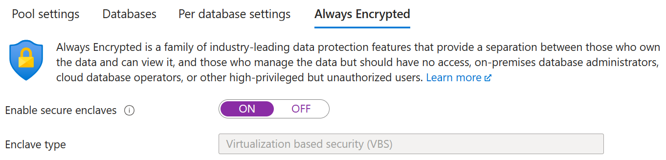 By default, a new database is created without VBS enclaves. To enable a VBS enclave in your database or elastic pool, you need to set the preferredEnclaveType database property to VBS, which activates the VBS enclave for the database or the elastic pool. You can set preferredEnclaveType when you create a new database or elastic pool or by updating an existing database or elastic pool. Any database you add to an elastic pool will inherit the enclave property from it, like the database SLO. Hence, if you add a database without VBS enclaves enabled to an elastic pool with VBS enabled, this new database becomes part of elastic pool and VBS enclaves will be enabled on this database. Adding a database with VBS enclaves enabled to an elastic pool without VBS enclaves is not supported.