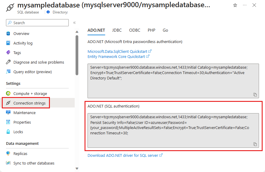 Navigate to the database pane in the Azure portal and, under Settings, select Connection strings.