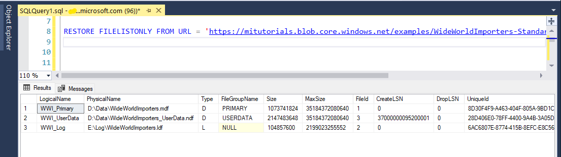 RESTORE FILELISTONLY FROM URL = 'https://mitutorials.blob.core.windows.net/examples/WideWorldImporters-Standard.bak';