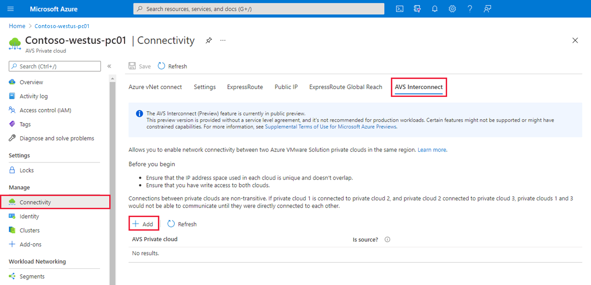 In your Azure VMware Solution private cloud, under Manage, select Connectivity.