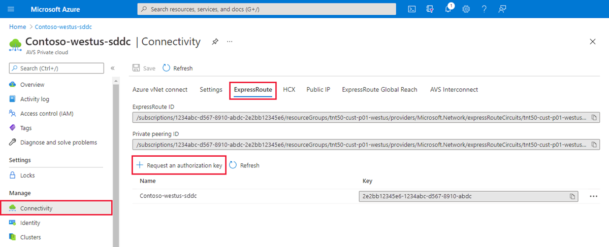 Select the ExpressRoute tab, and then select + Request an authorization key.