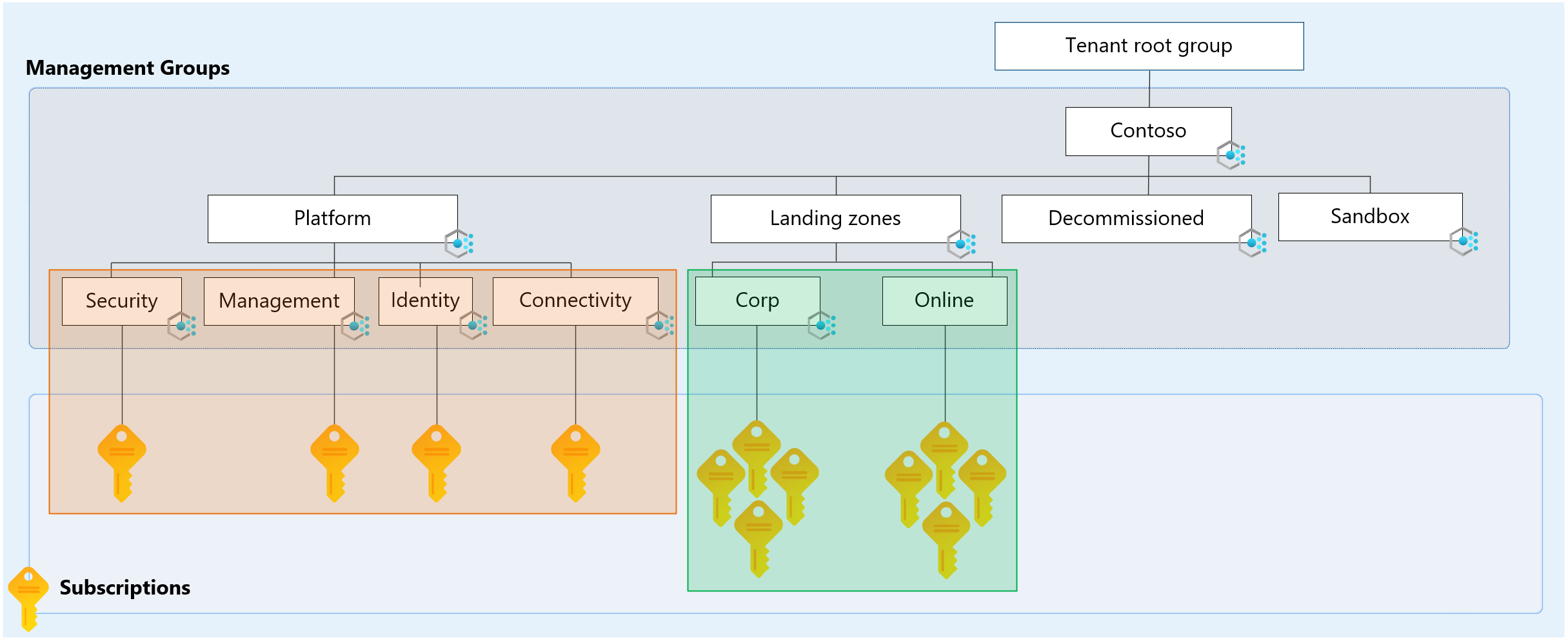 You might also want to tailor the area highlighted in orange underneath the Platform management group. The zones in this area are known as platform landing zones.