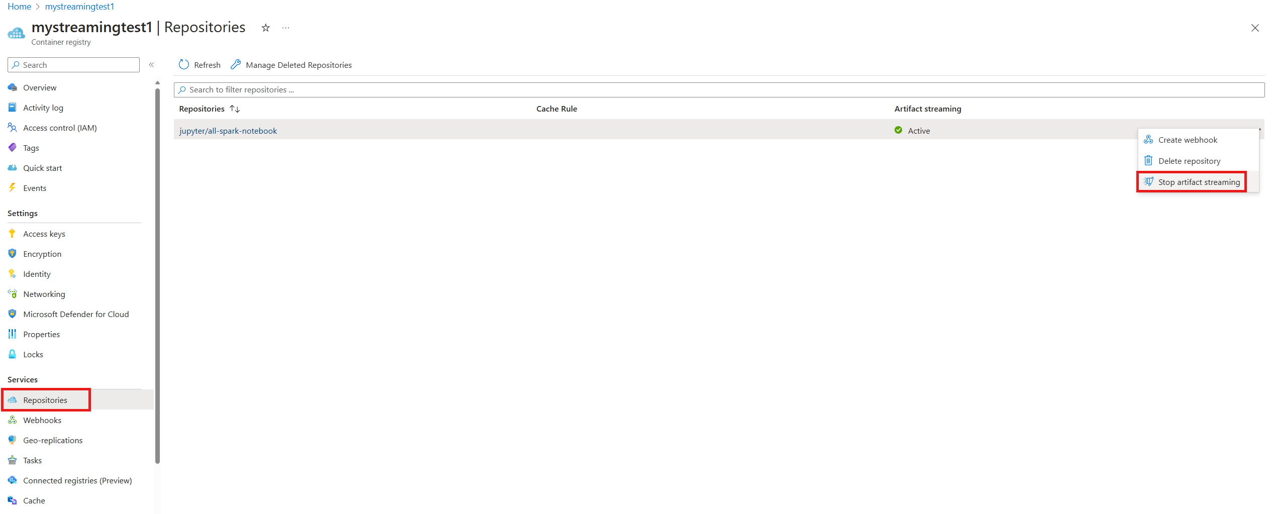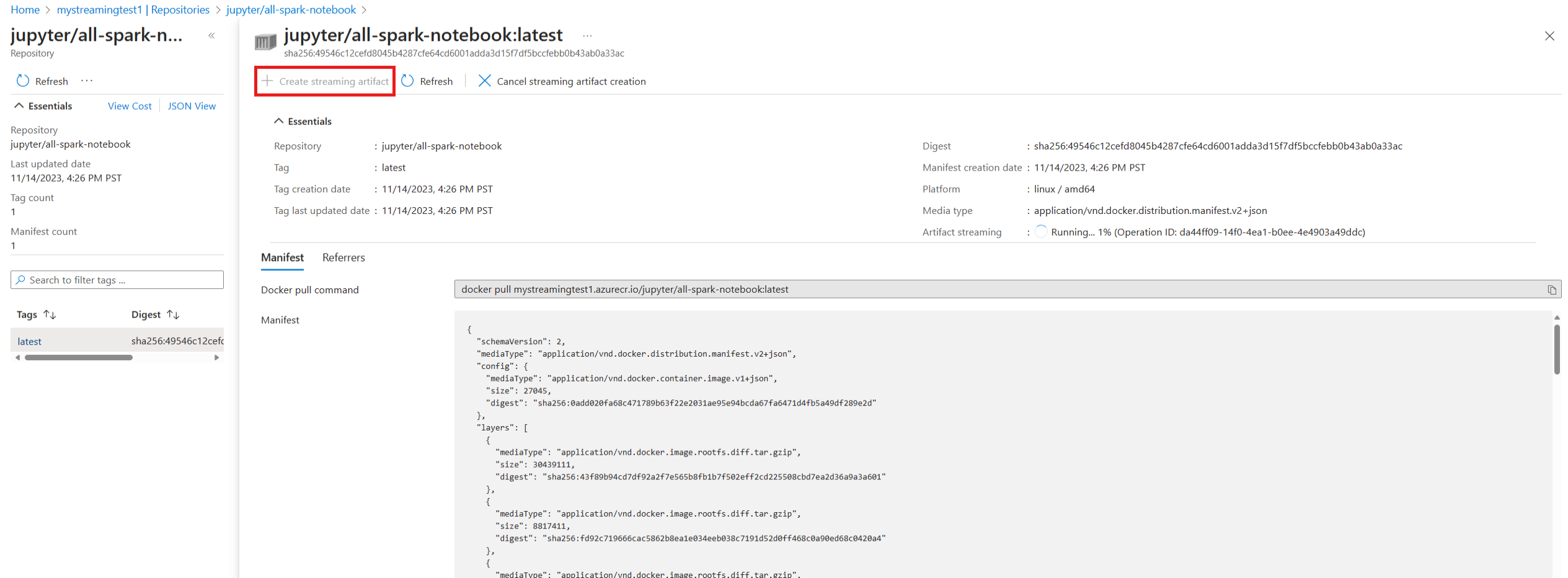 mystreamingtestACR.az configure --defaults acr="mystreamingtest" az acr import --source docker.io/jupyter/all-spark-notebook:latest -t jupyter/all-spark-notebook:latestCreate an artifact streaming from the Image