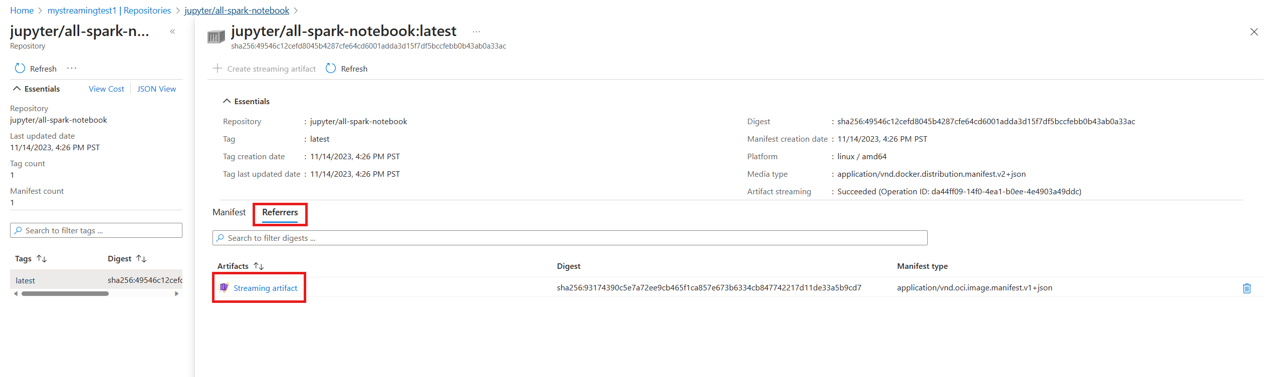 jupyter/all-spark-notebook:latestimage in themystreamingtestACR.az acr manifest list-referrers -n jupyter/all-spark-notebook:latestCancel the artifact streaming creation (if needed)