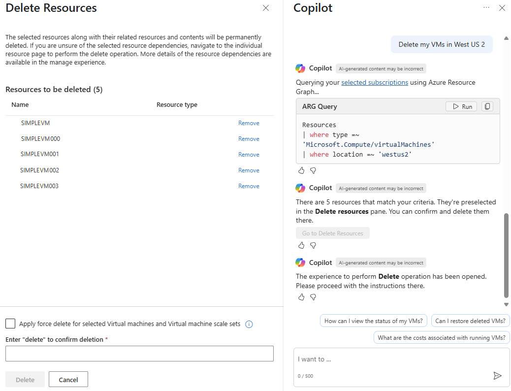 Similarly, if you say "Delete my VMs in West US 2", Copilot in Azure runs a query and then asks you to confirm before running the delete command.