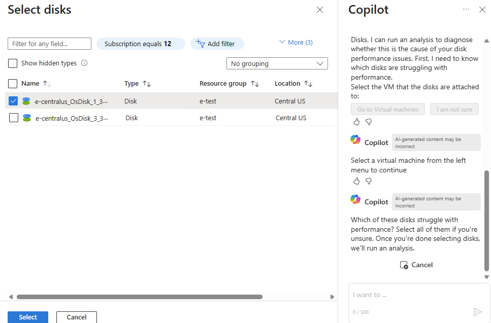 After you select a VM, you're prompted to select one or more disks for Copilot in Azure to analyze.