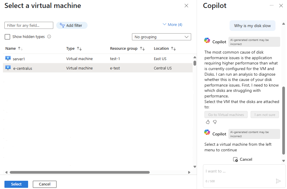 When you ask Microsoft Copilot in Azure questions about disk performance, it prompts you to select the VM and disks that are struggling with performance, along with the time period when the problems started. For best results, when specifying a time frame for the analysis, ensure that the disk and VM have been active during that entire period.