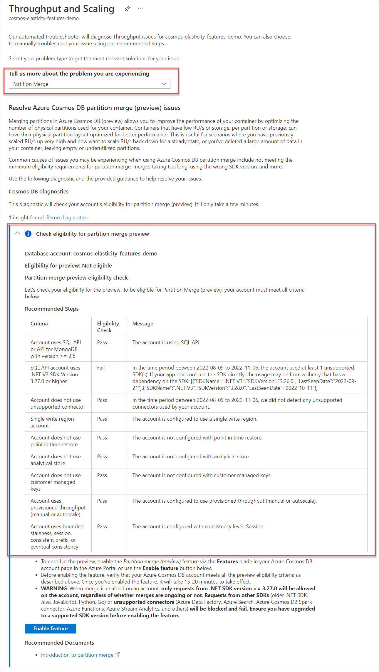 To check whether an Azure Cosmos DB account is eligible for the preview, you can use the built-in eligibility checker in the Azure portal. From your Azure Cosmos DB account overview page in the Azure portal, navigate to Diagnose and solve problems -> Throughput and Scaling -> Partition Merge. Run the Check eligibility for partition merge preview diagnostic.
