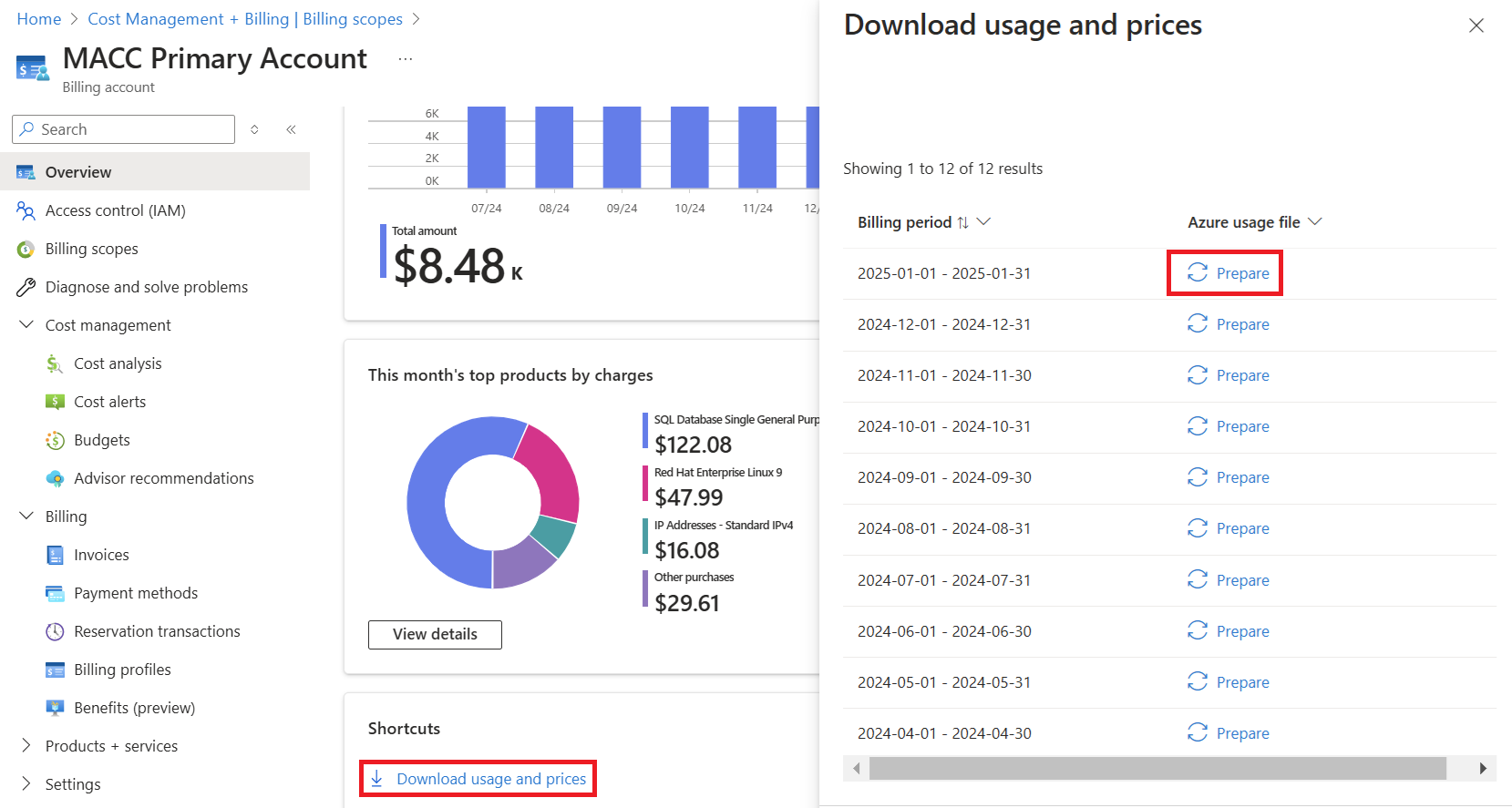 - On the billing scope overview page, at the bottom of the page under Shortcuts, select Download usage and prices.
