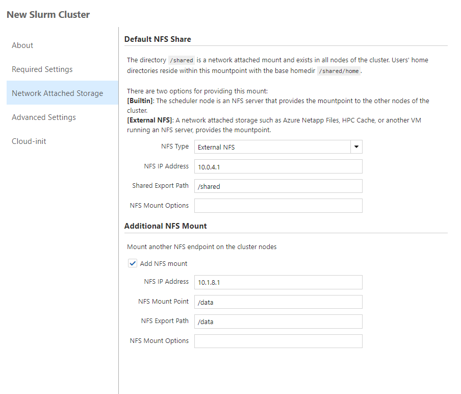 | NAS Options in Default Cluster Templates Default cluster templates shipped in CycleCloud 8.1 now include a section for configuring network filesystem mounts. With this feature, mounting NFS shares no longer requires changes to a cluster template. |