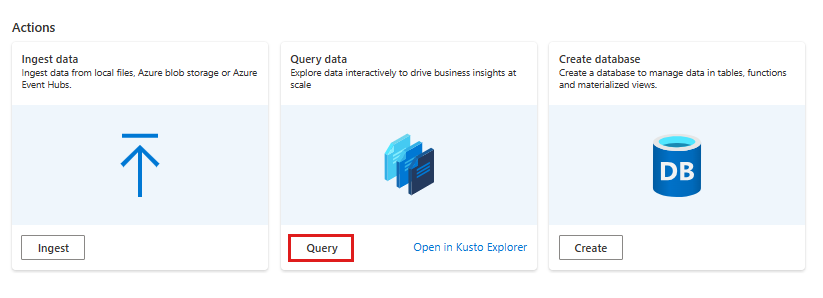Under Actions, find the Query data panel. Then, select Query. Paste the command .show databases into the query window, then select Run. The result set shows TestDatabase, the only database in the cluster.