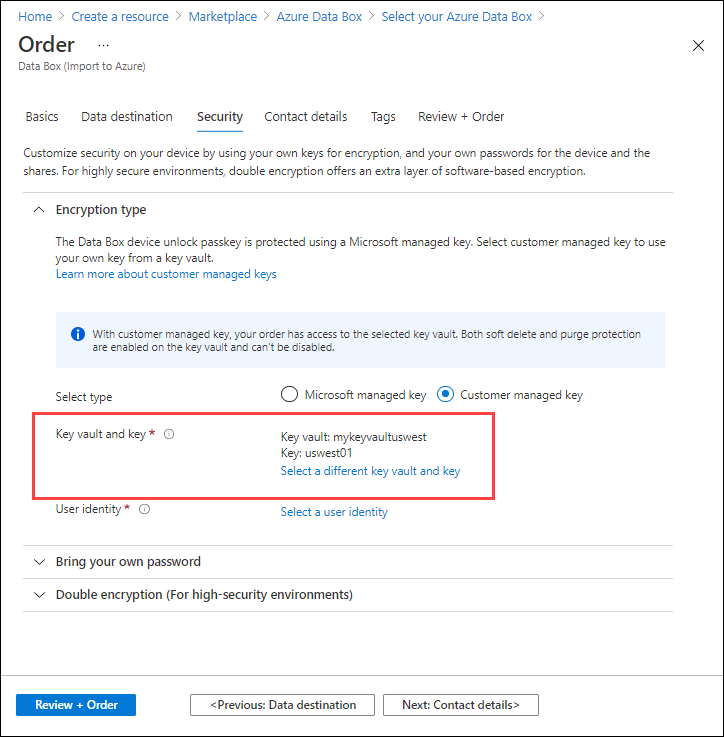 Configuring a customer-managed key for your Azure Data Box Disk is optional. By default, Data Box uses a Microsoft managed key to protect the unlock passkey.