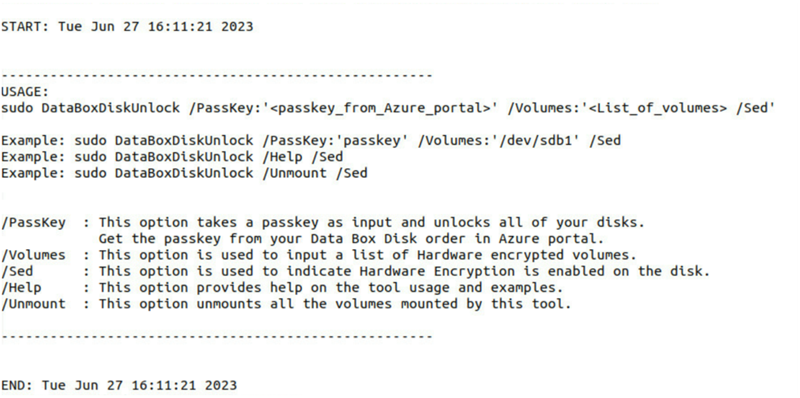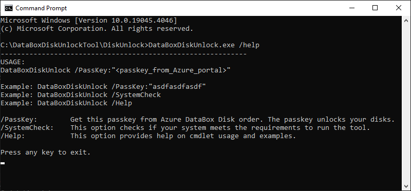 Repeat the unlock steps for any future disk reinserts. If you need help with the Data Box Disk unlock tool, use the help command as shown in the following sample code and example output.
